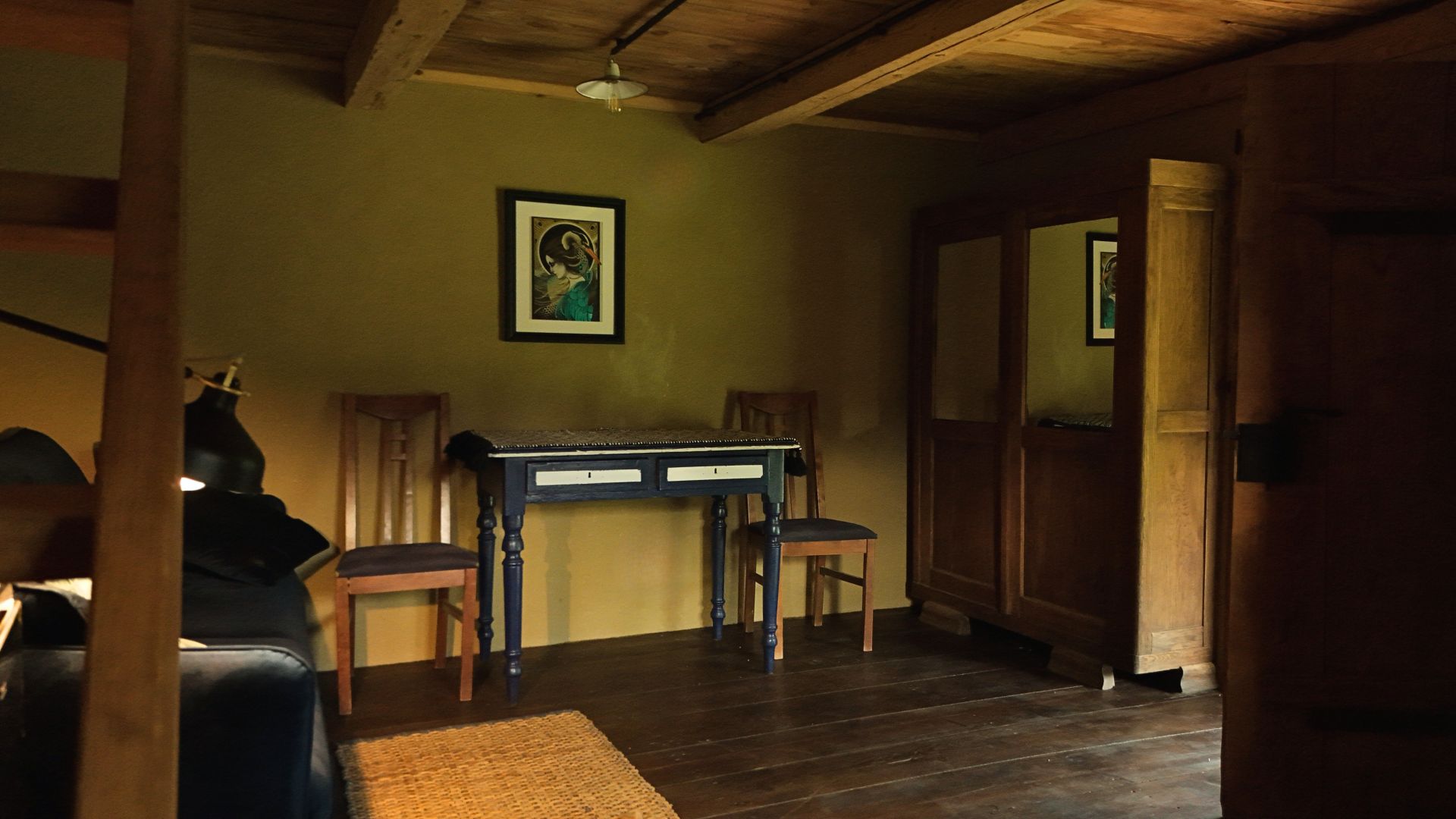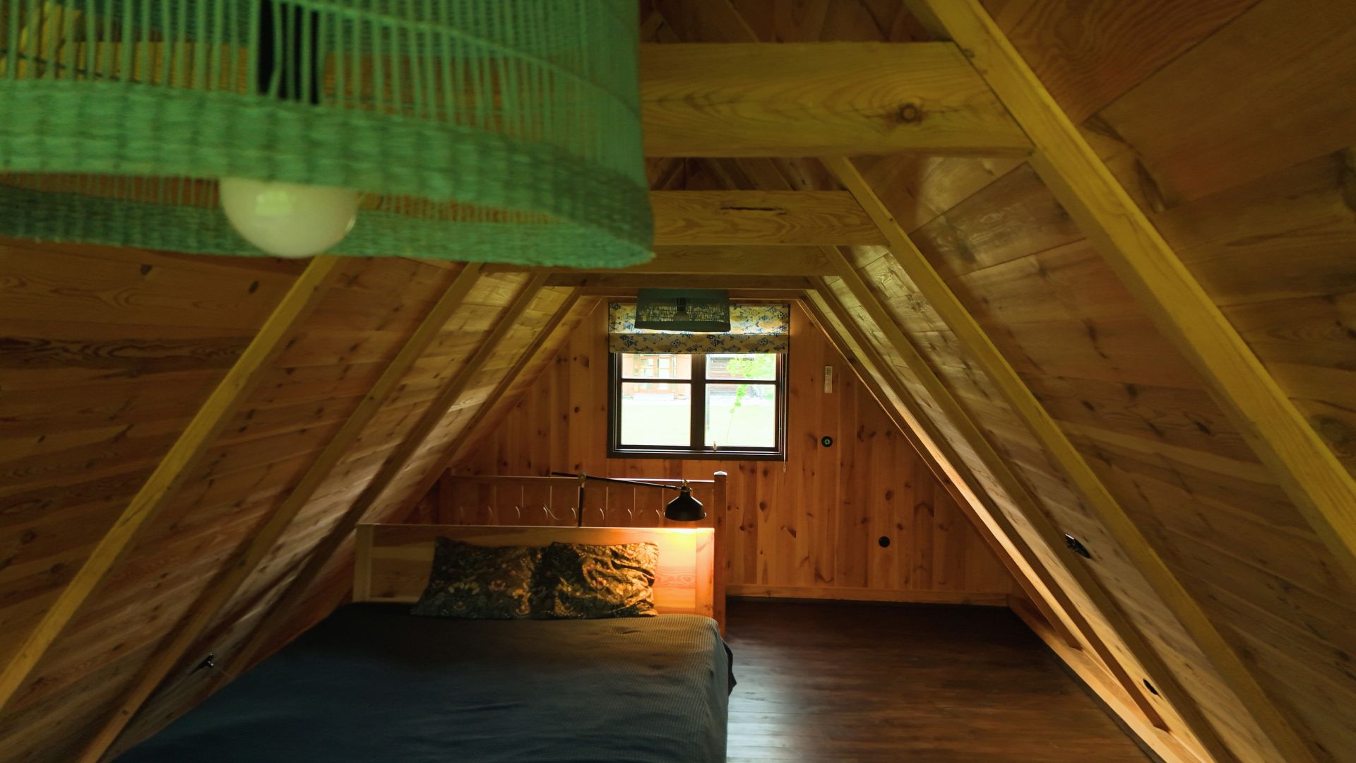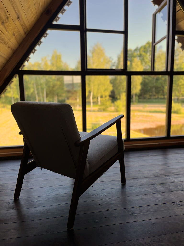 Na górze domku czeka na Was łóżko 180×200 cm, fotele, komoda, klimatyzacja i wielkie panoramiczne okno z widokiem na las.